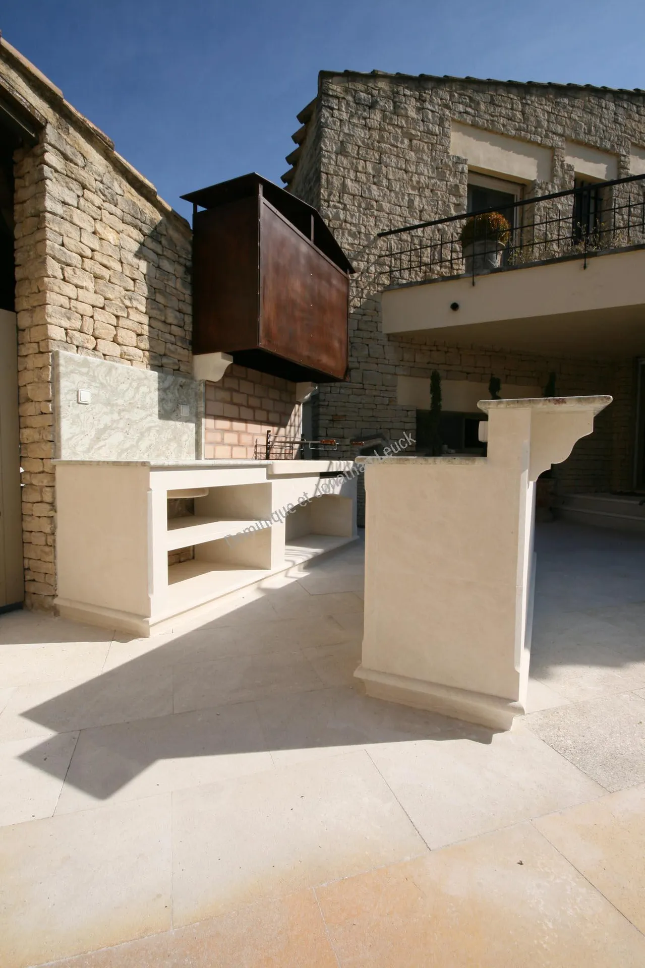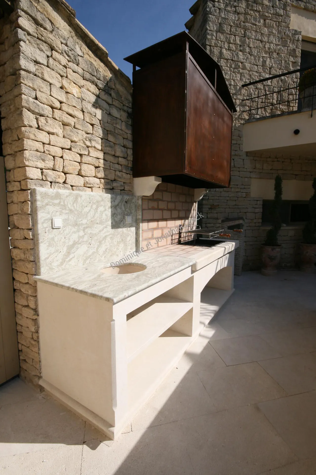 Aménagement d'une cuisine d'été extérieur en pierre avec plans en granit.