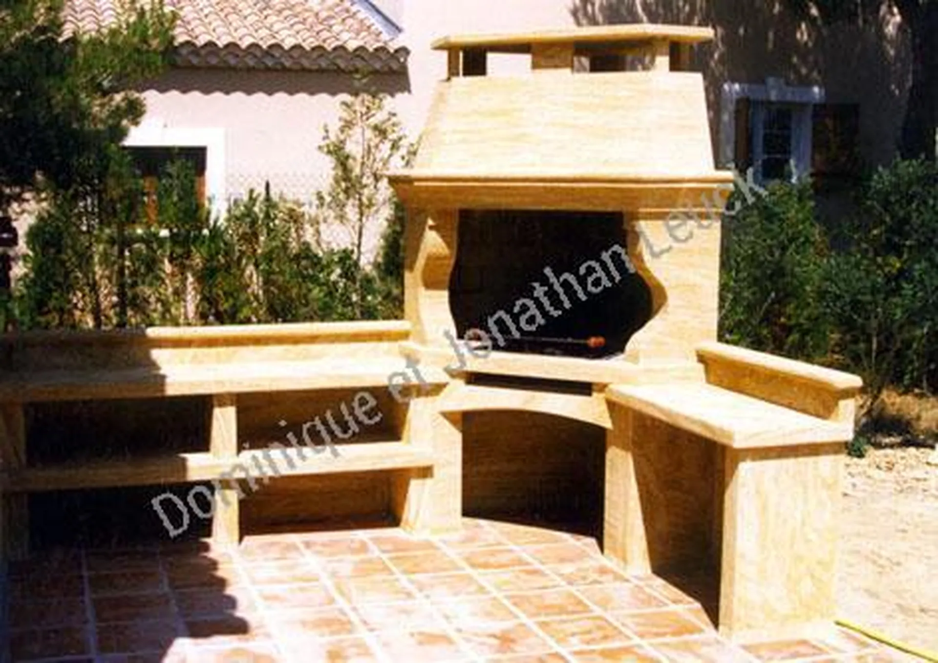 Barbecue de terrasse en pierre du Gard avec plans de travail.