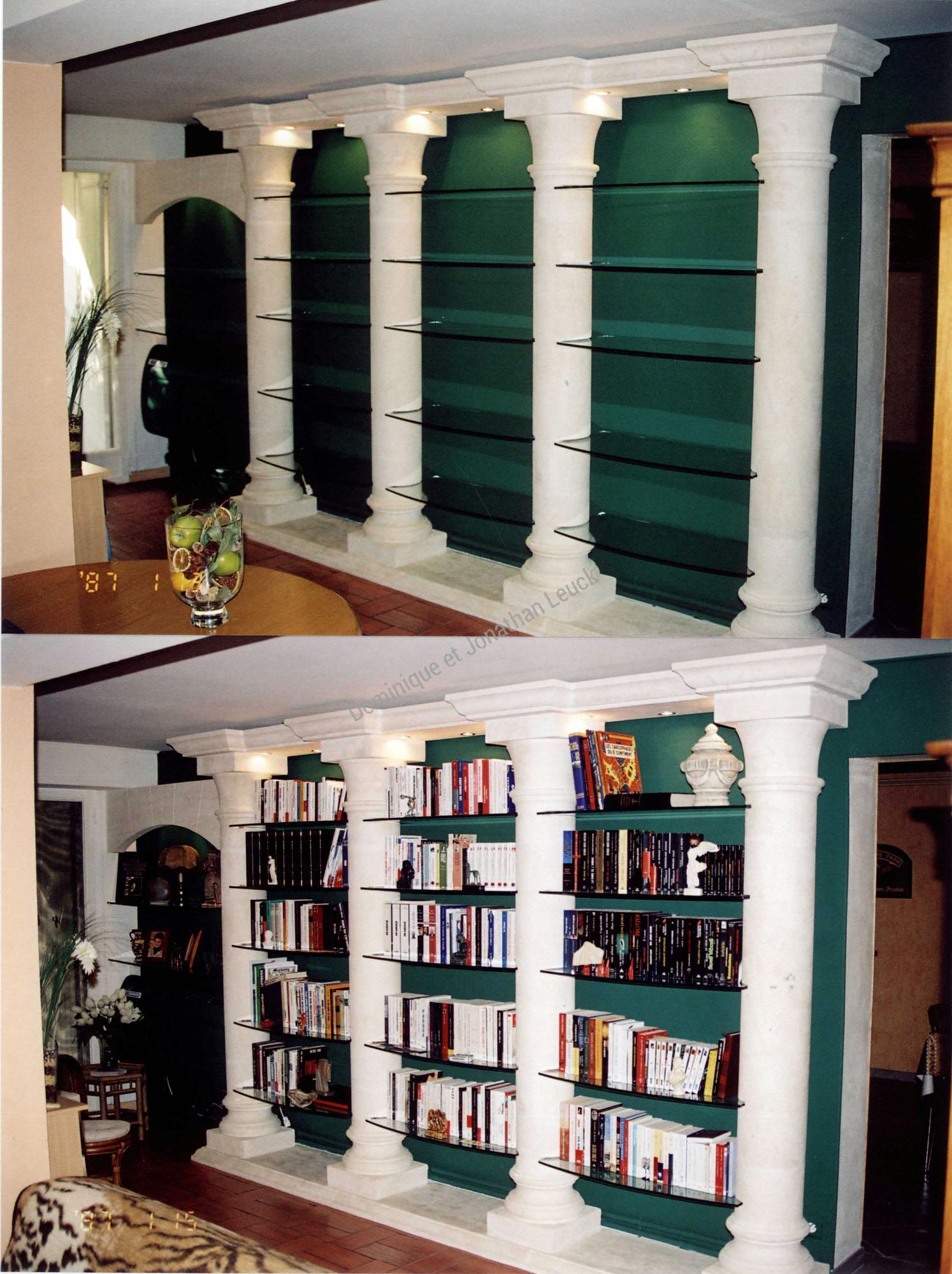 Bibliothèque en pierre d'Estaillades réalisé sur mesure avec colonnes et corniche.