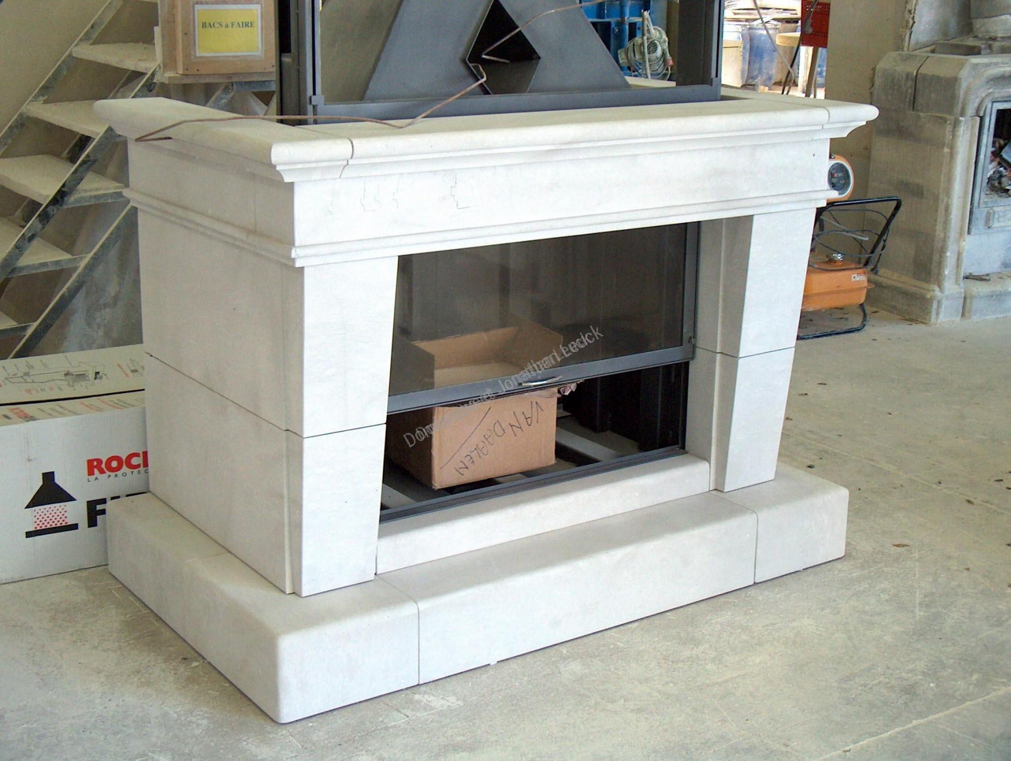Cheminée en pierre de Richemont bleu de Poitier avec foyer fermé TOTEM Fire Frontal 1100.