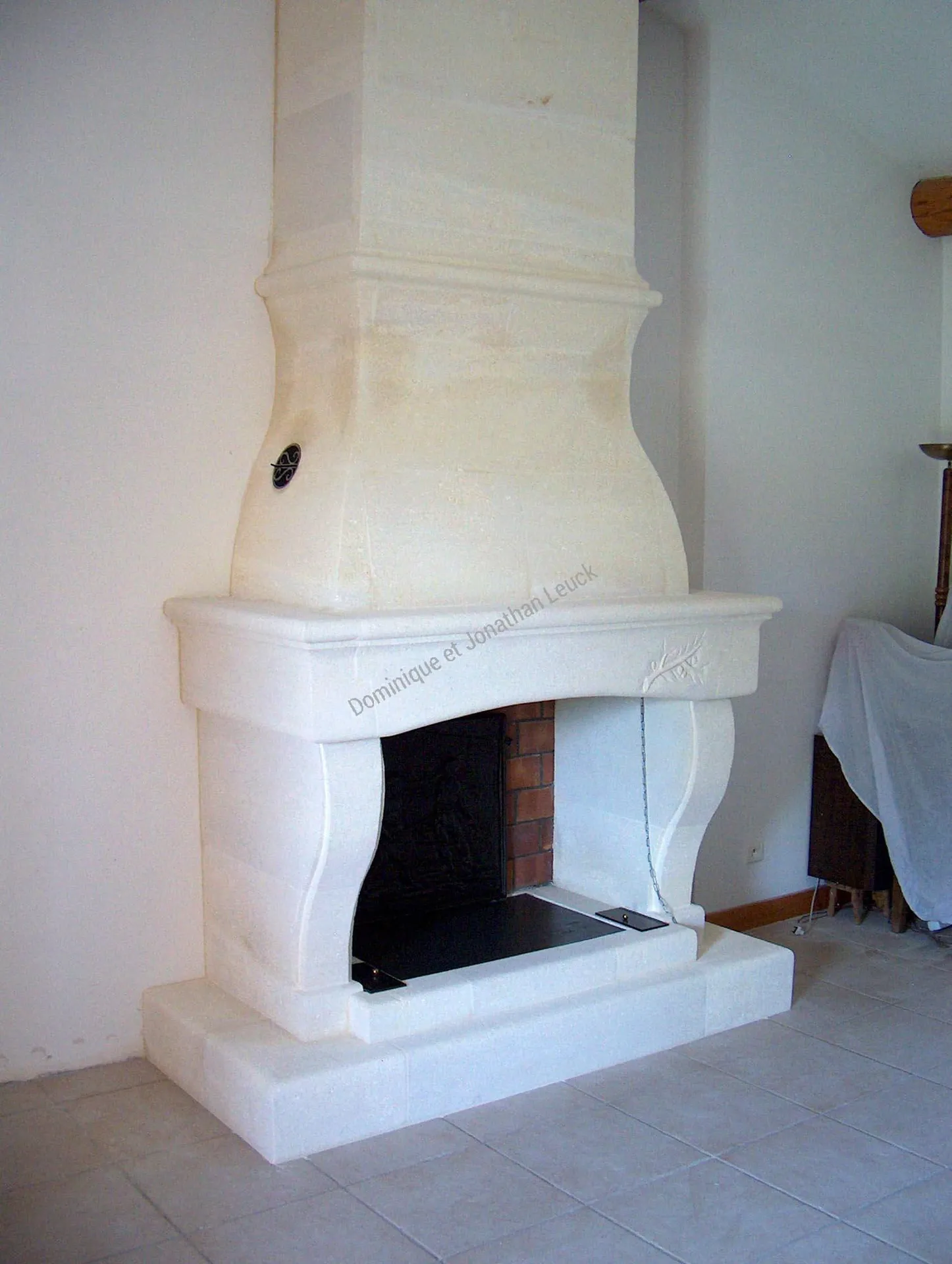 Cheminée avec hotte en massif galbée en pierre blanche d'Estaillades.