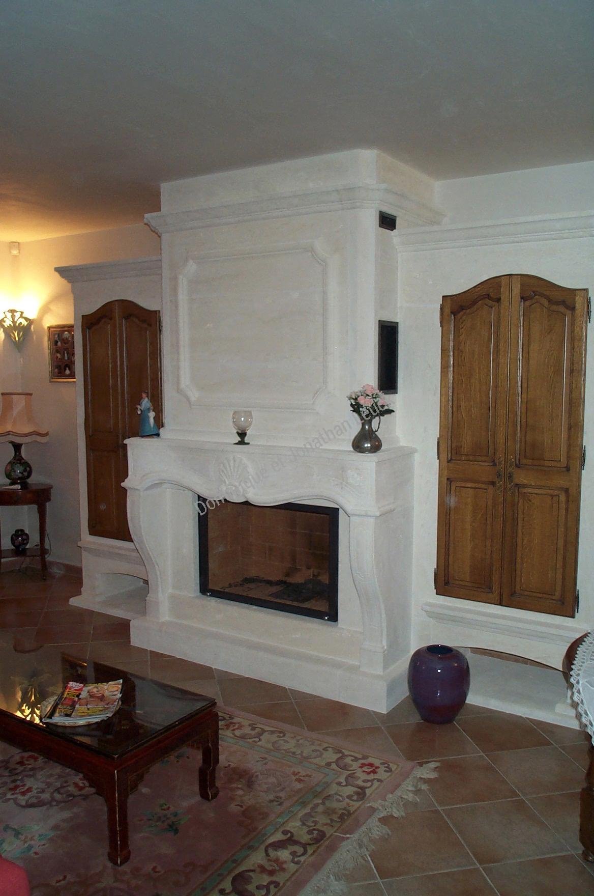 Cheminée, hotte et aménagements en pierre d'Estaillades avec foyer fermé TOTEM Fire Frontal 1100.