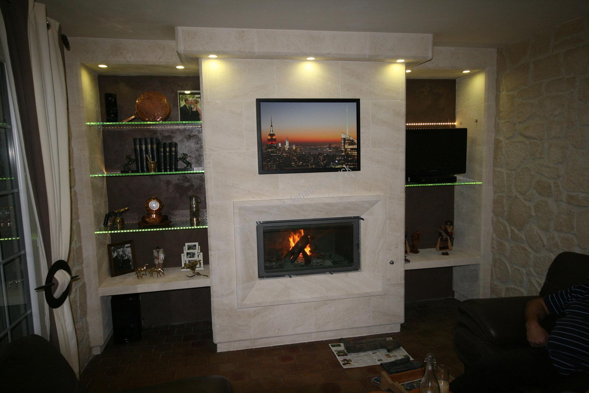 Cheminée et aménagements en pierre d'Estaillades avec foyer Flaming et étagères en verres.