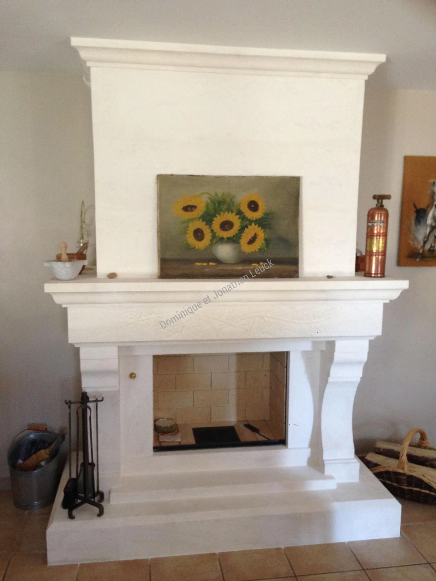 Cheminée et hotte en pierre d'Estaillades avec foyer fermé TOTEM Fire type Eventail 1000 éco.