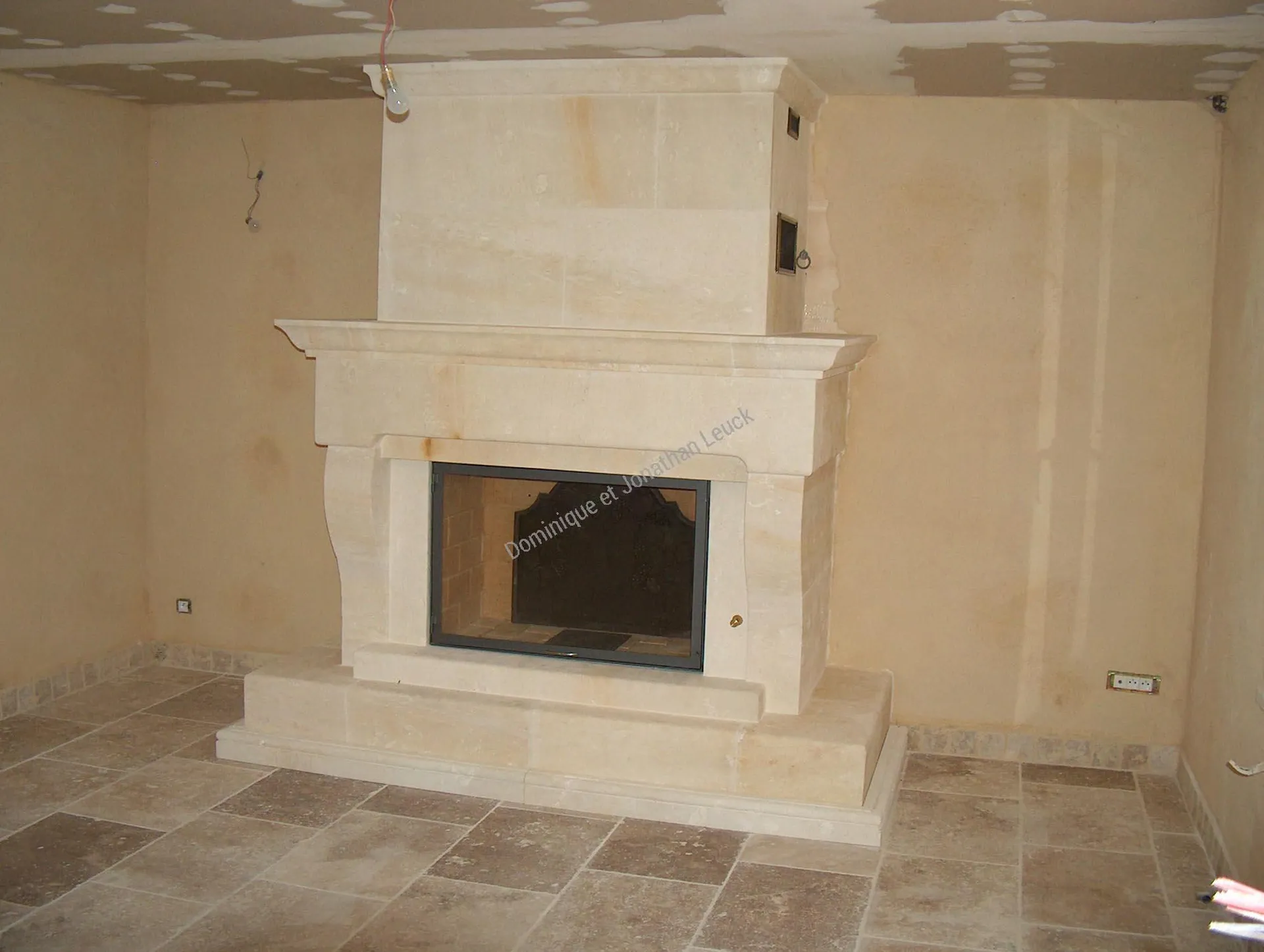 Cheminée et hotte en pierre de Fontvieille avec foyer fermé TOTEM Fire frontal 1100.