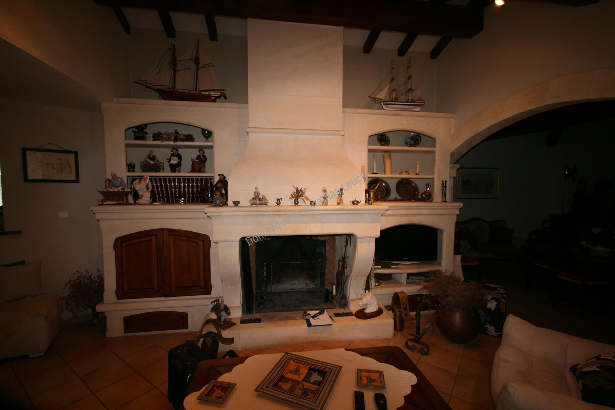 Cheminée et hotte galbée en massif avec aménagements rangements en pierre blanche d'Estaillades.