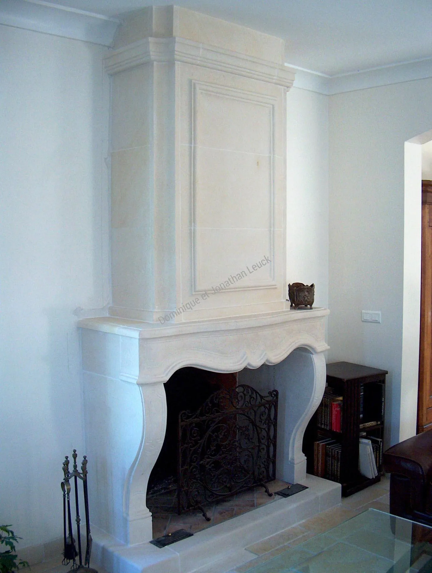 Cheminée Régence avec hotte trumeau en massif en pierre d'Estaillades, sculpté mains.