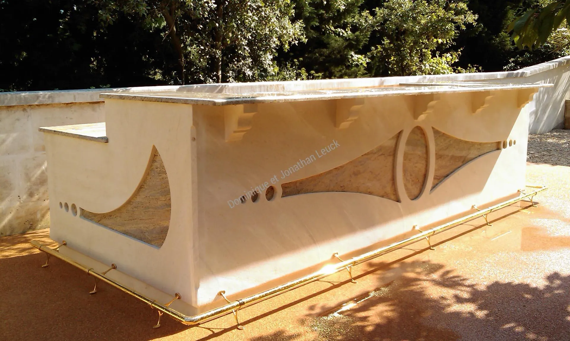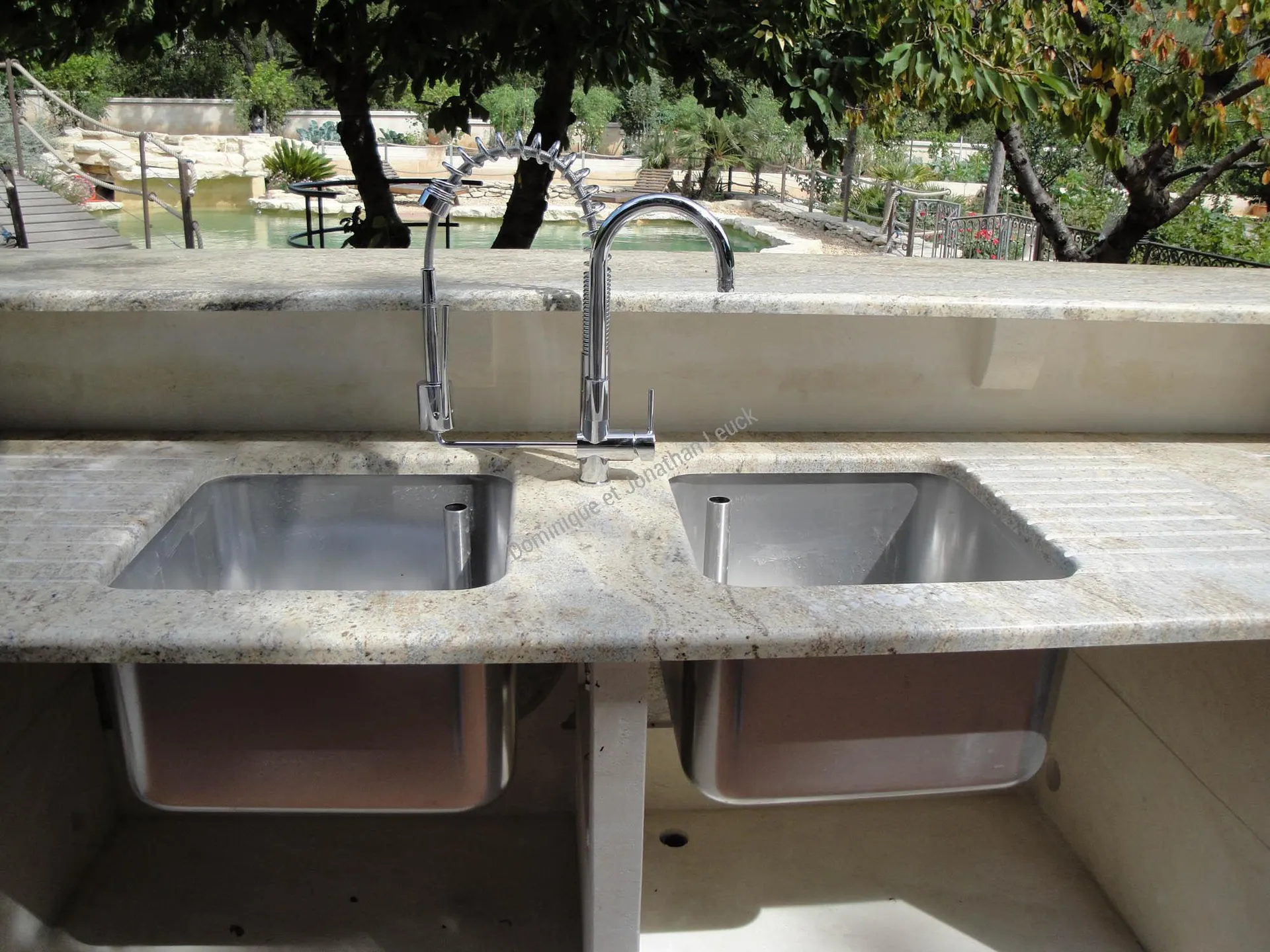 Comptoir d'un aménagement extérieur pierre d'Estaillades et granit Kashmir Gold.