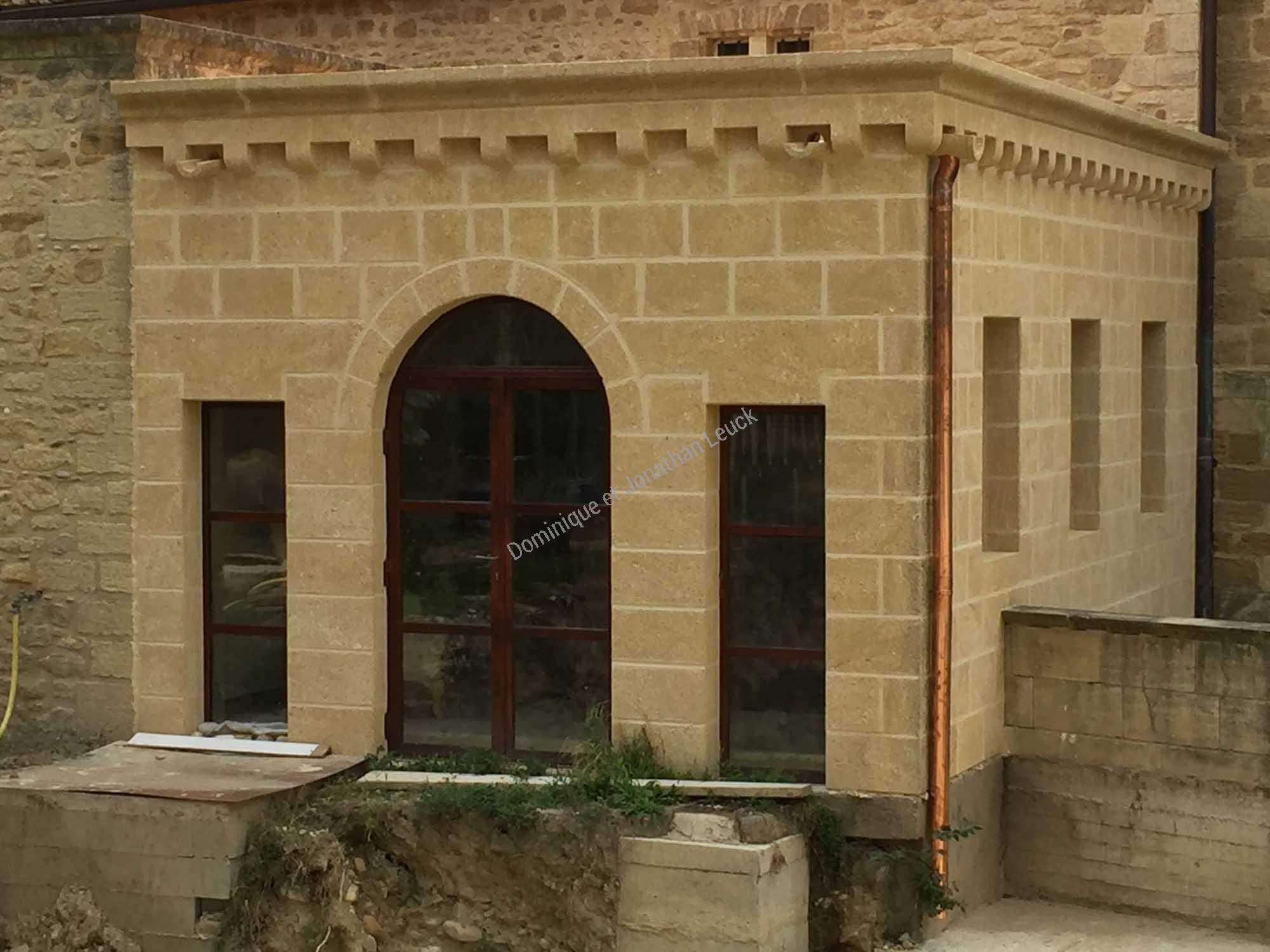 Réalisation d'encadrements en massifs pour un agrandissement d'une batisse avec corniche, encadrements et murs en pierre du Gard.