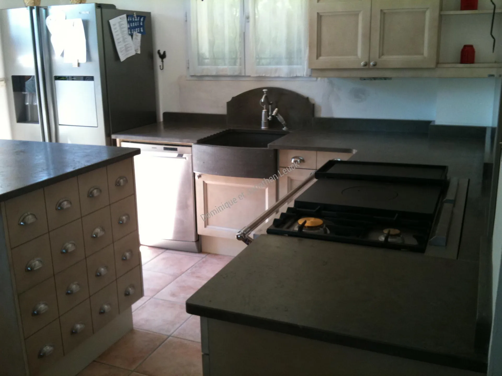 Cuisine sur-mesure, bâti en pierre blanche d'Estaillades et plans en pierre, marbre, granit ou en lave émaillée.