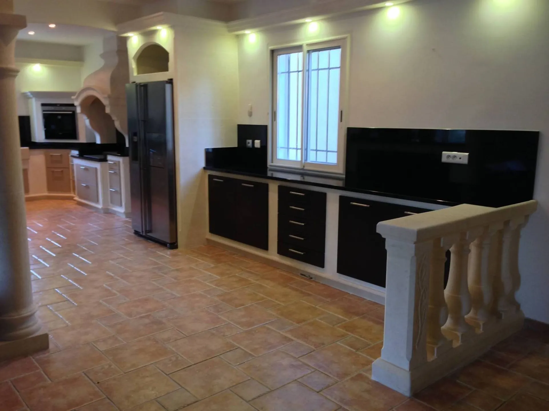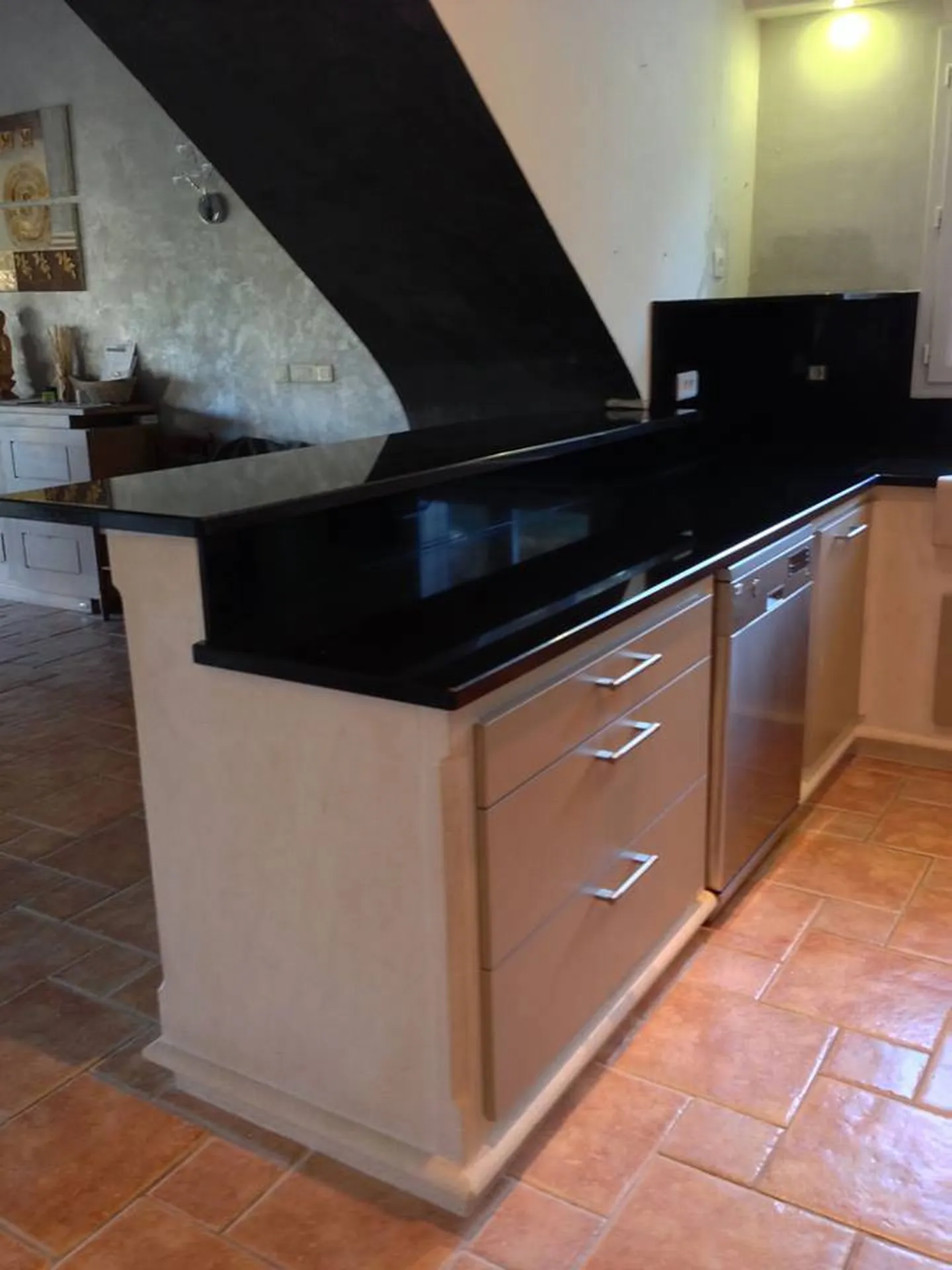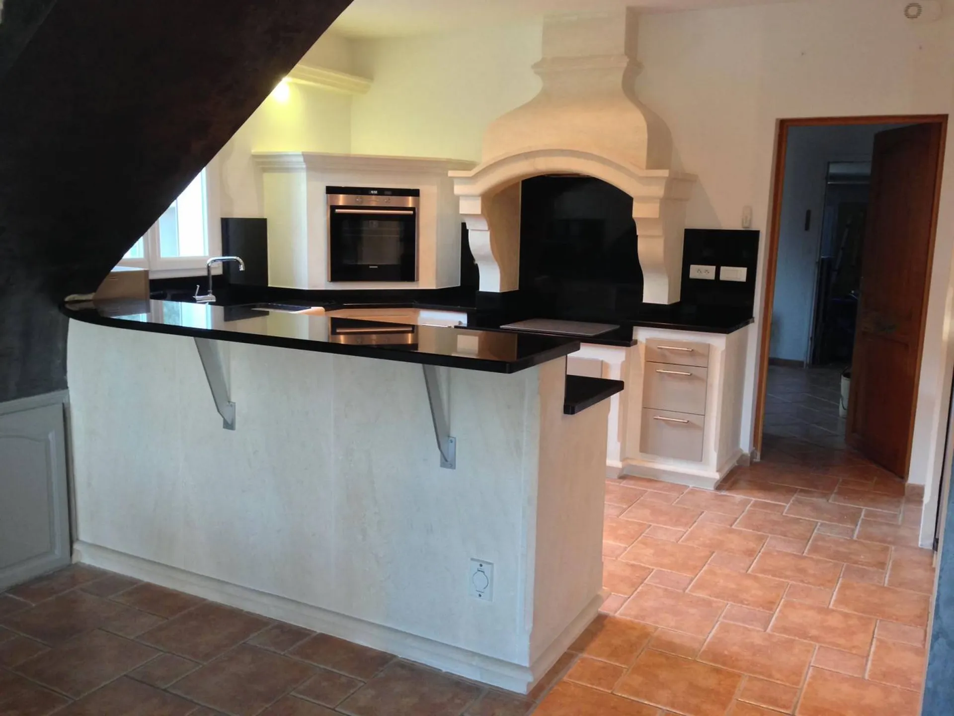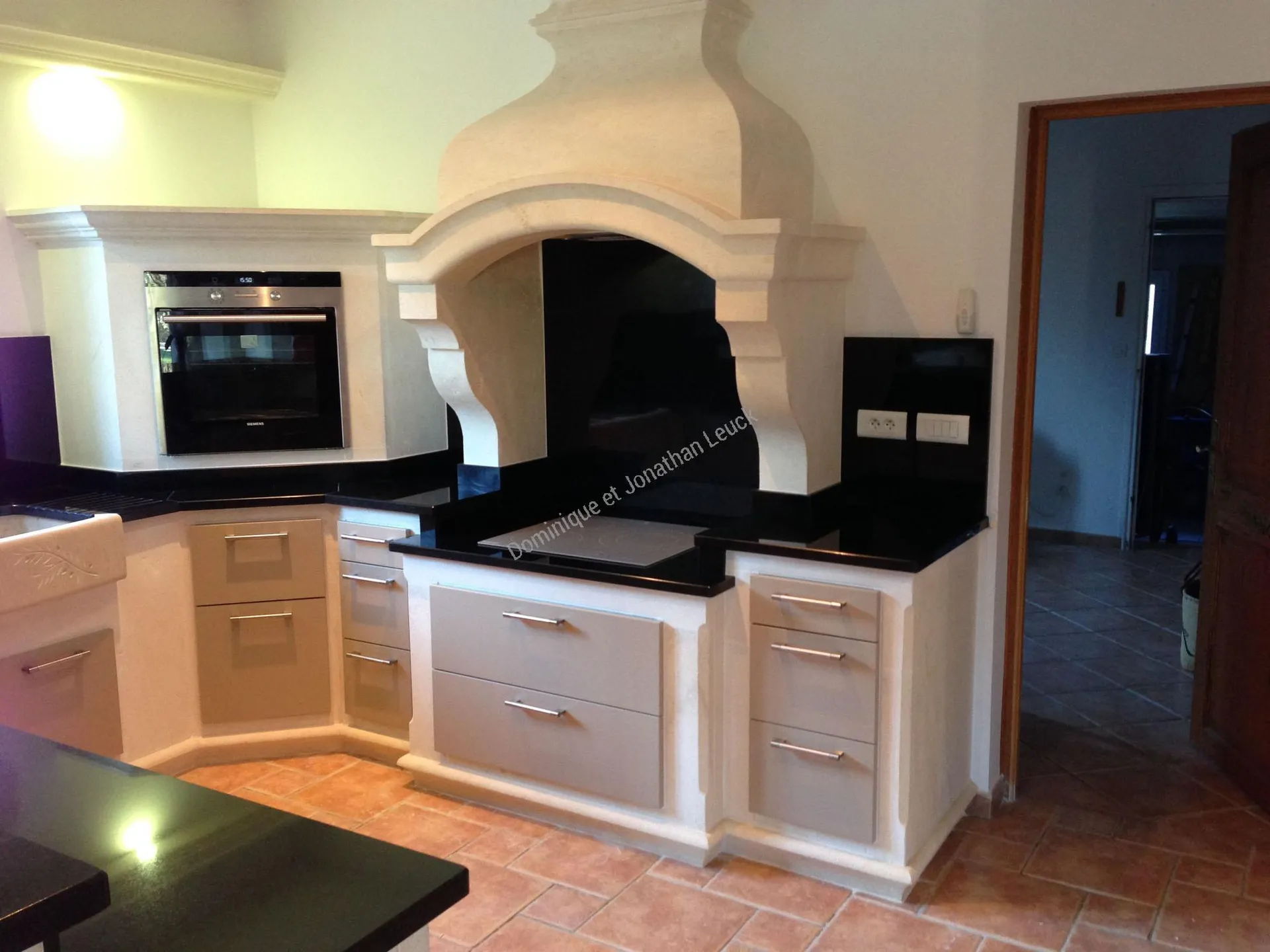 Création d'une Cuisine sur-mesure en granit noir Zimbabwe finition poli brillant ou velours (mat structuré) ainsi que la structure en pierre blanche d'Estaillades du Luberon sur Eygalières.