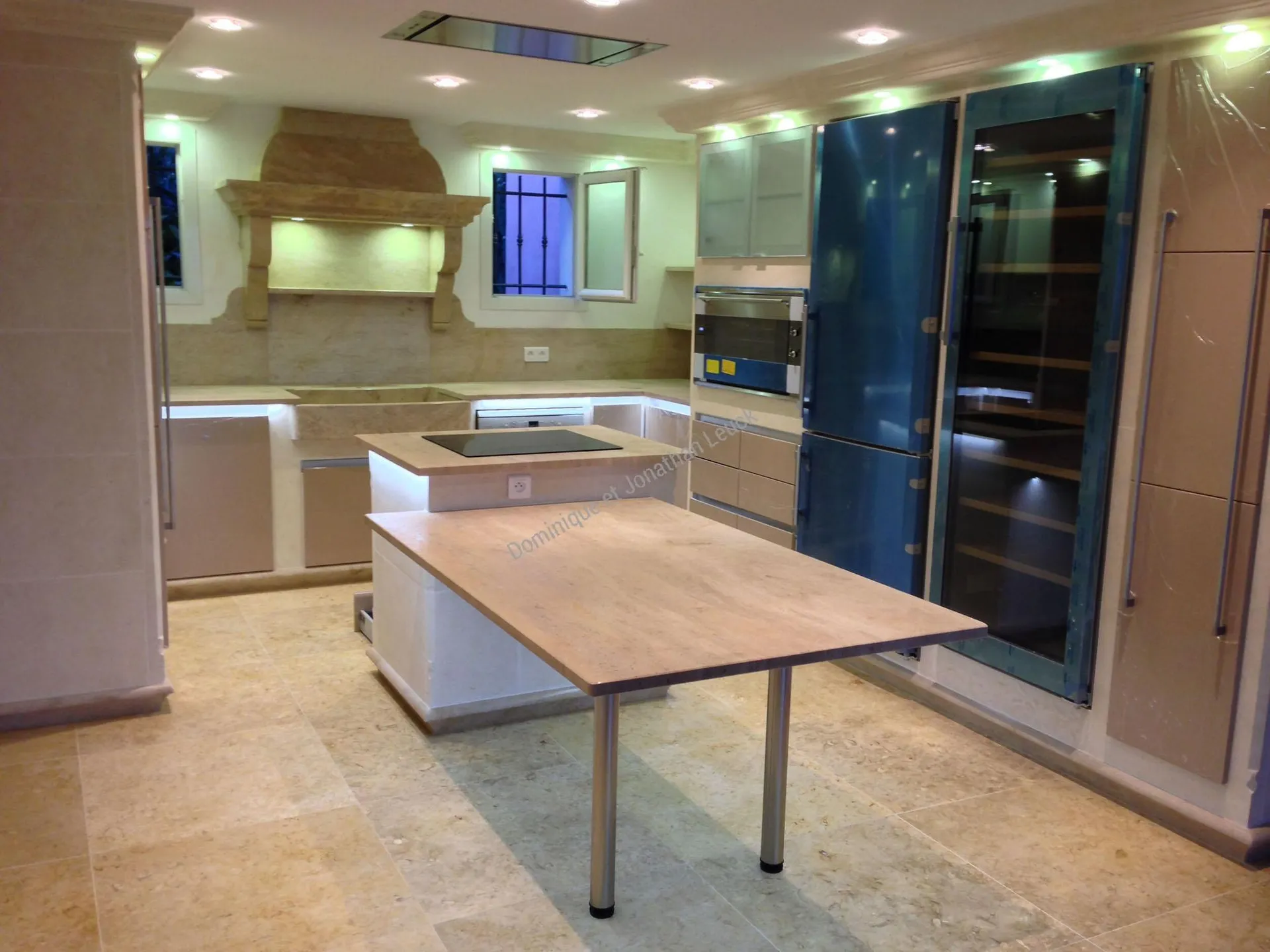 Création d'un Concept Cuisine sur-mesure en pierre de Bourgogne (Beauval) finition adouci ou velours (mat structuré) ainsi que la structure en pierre blanche d'Estaillades du Luberon sur Maubec, et les plinthes en pierre de Bourgogne.