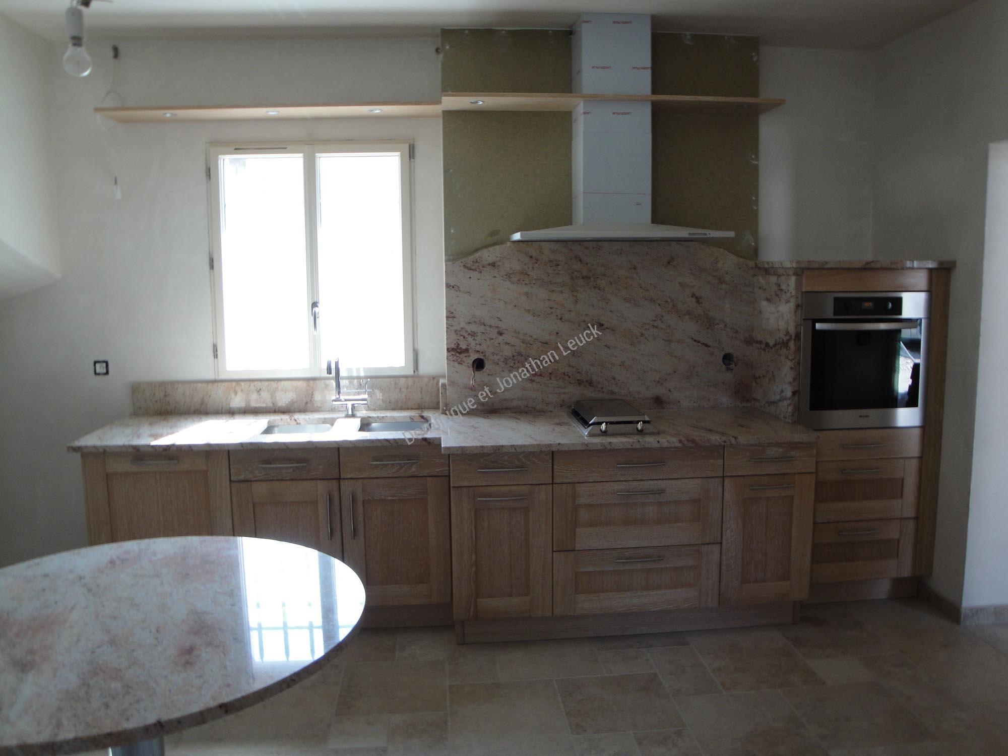 Création d'une Cuisine sur-mesure en granit Shivakashi finition poli brillant ainsi qu'un plateau rond de table en granit Shivakashi finition poli brillant sur Paradou.