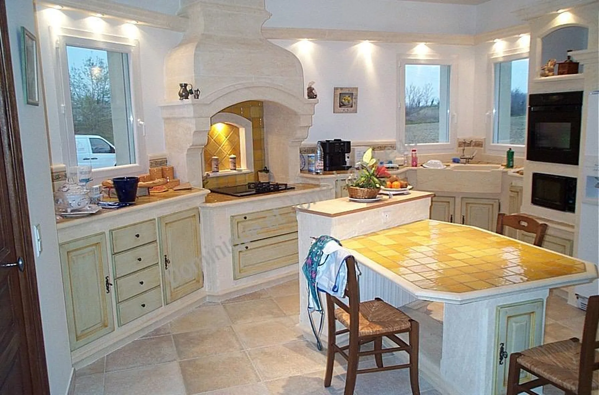 Réalisation d'une cuisine sur-mesure de type Provençale ou l'on retrouve les bâti en pierre blanche d'Estaillades du Luberon et plans en carreaux de lave émaillée mais il est possible de vous les concevoir en Marbre, pierre et Granit aux couleurs de votre choix parmi une sélection d'un grand nombre de coloris ainsi qu'en pierre dure de Bourgogne.