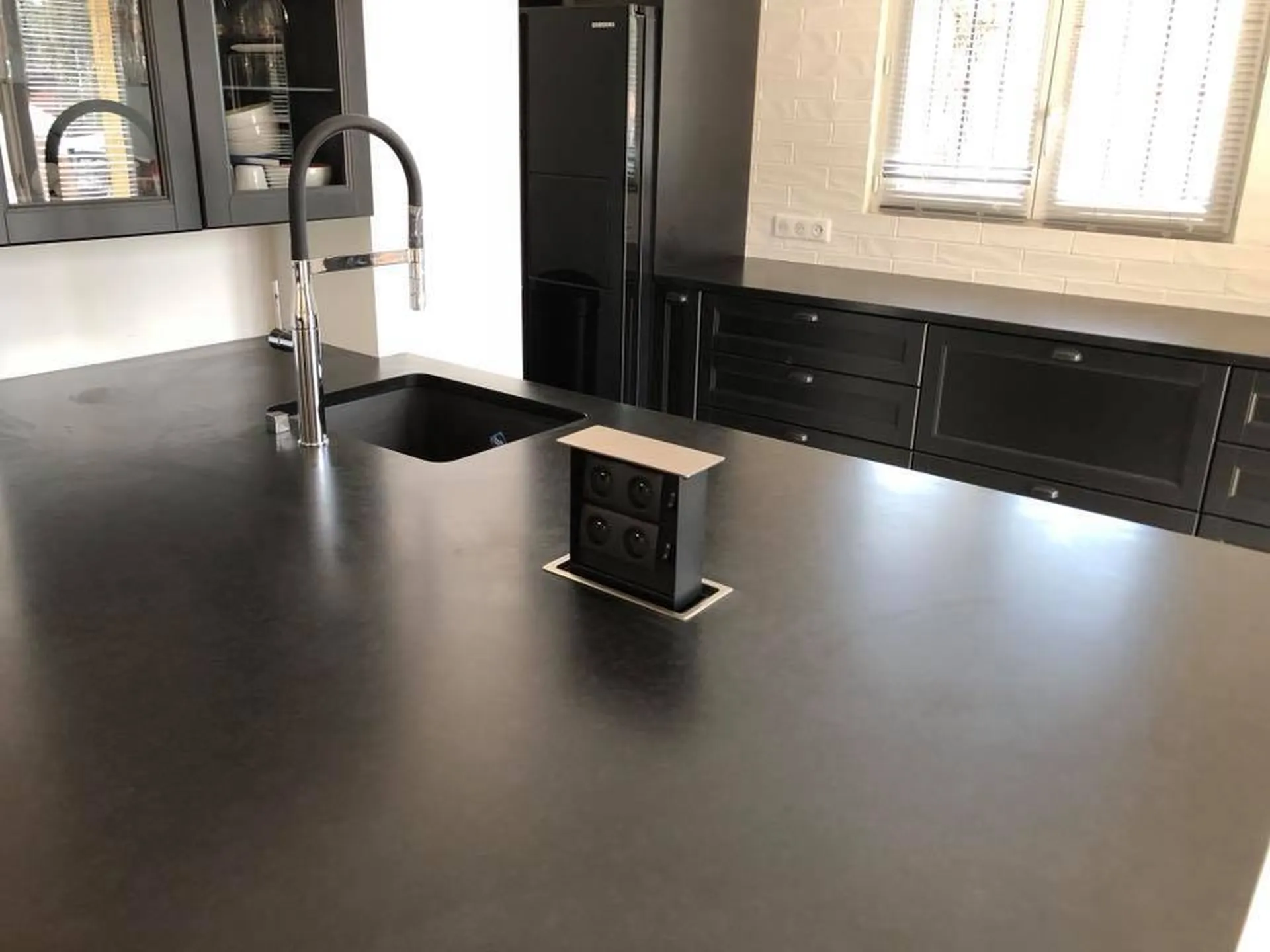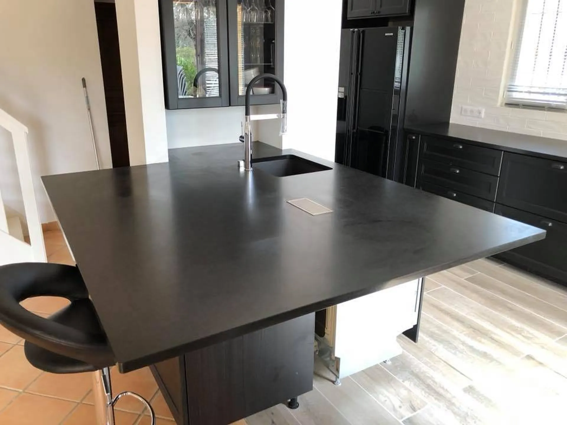 Réalisation d'un plan de travail de Cuisine sur-mesure en granit type Zimbabwe finition poli brillant ou velours (mat structuré) sur Nice.