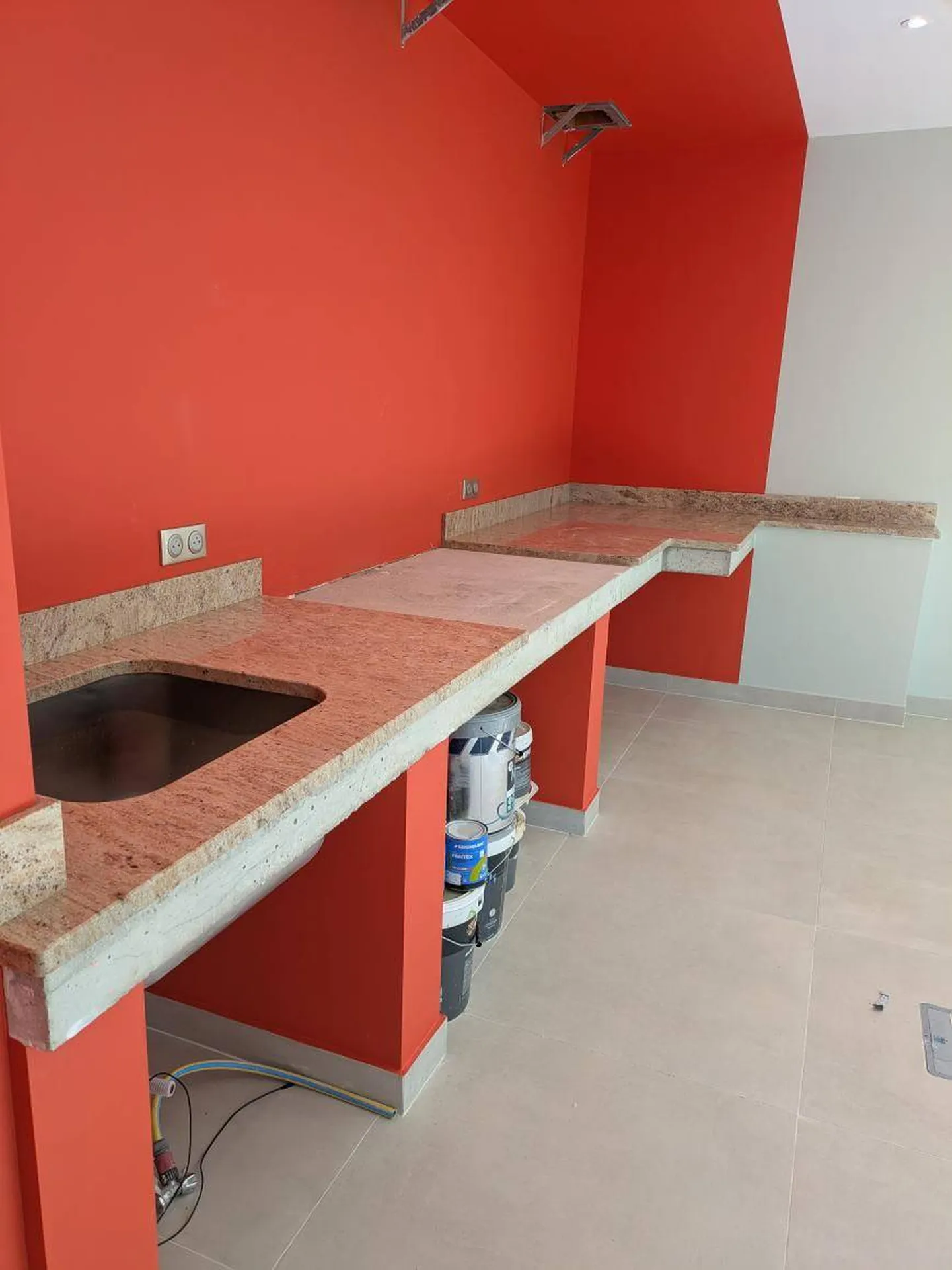 L'aspect tacheté typique du Granit dans ces tons de beige contraste parfaitement à ce rouge vif et apporte de la douceur et de la lumière à cette pièce.