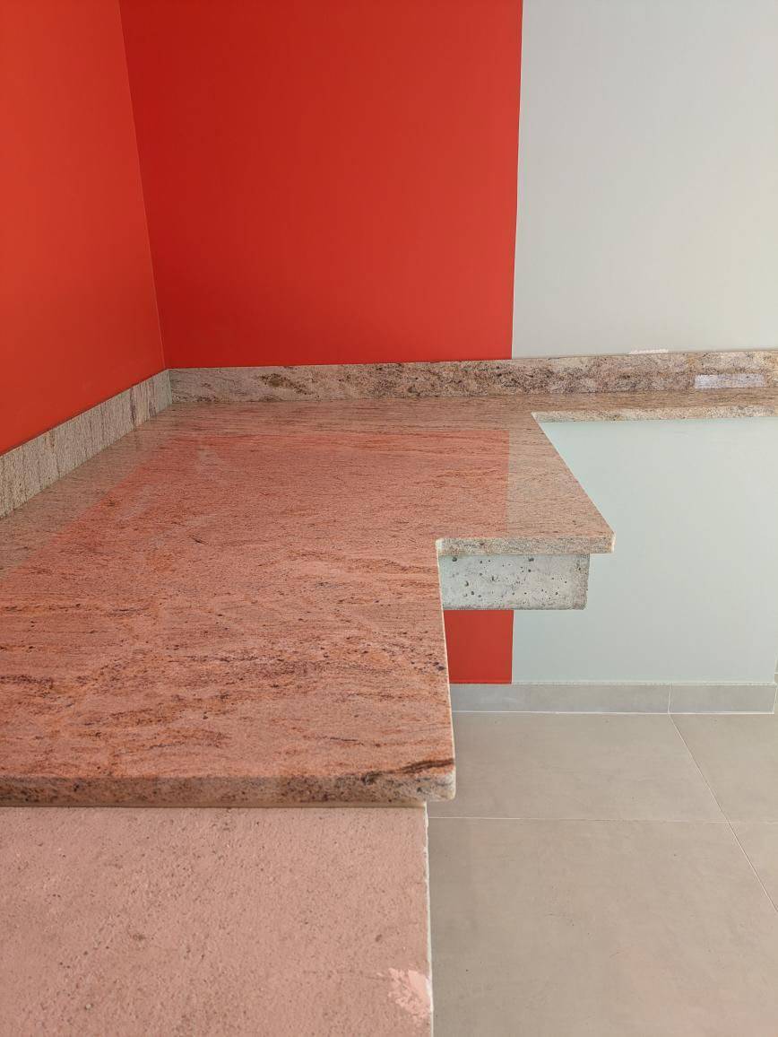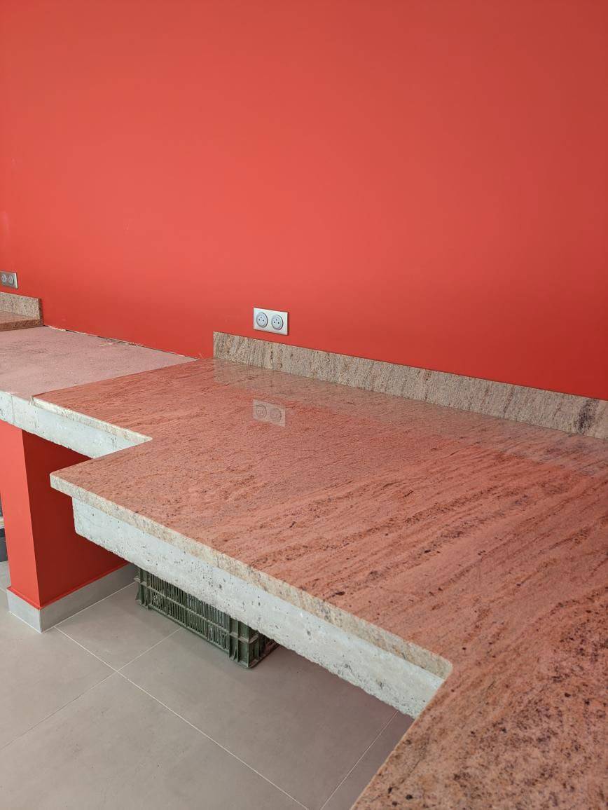 L'aspect tacheté typique du Granit dans ces tons de beige contraste parfaitement à ce rouge vif et apporte de la douceur et de la lumière à cette pièce.