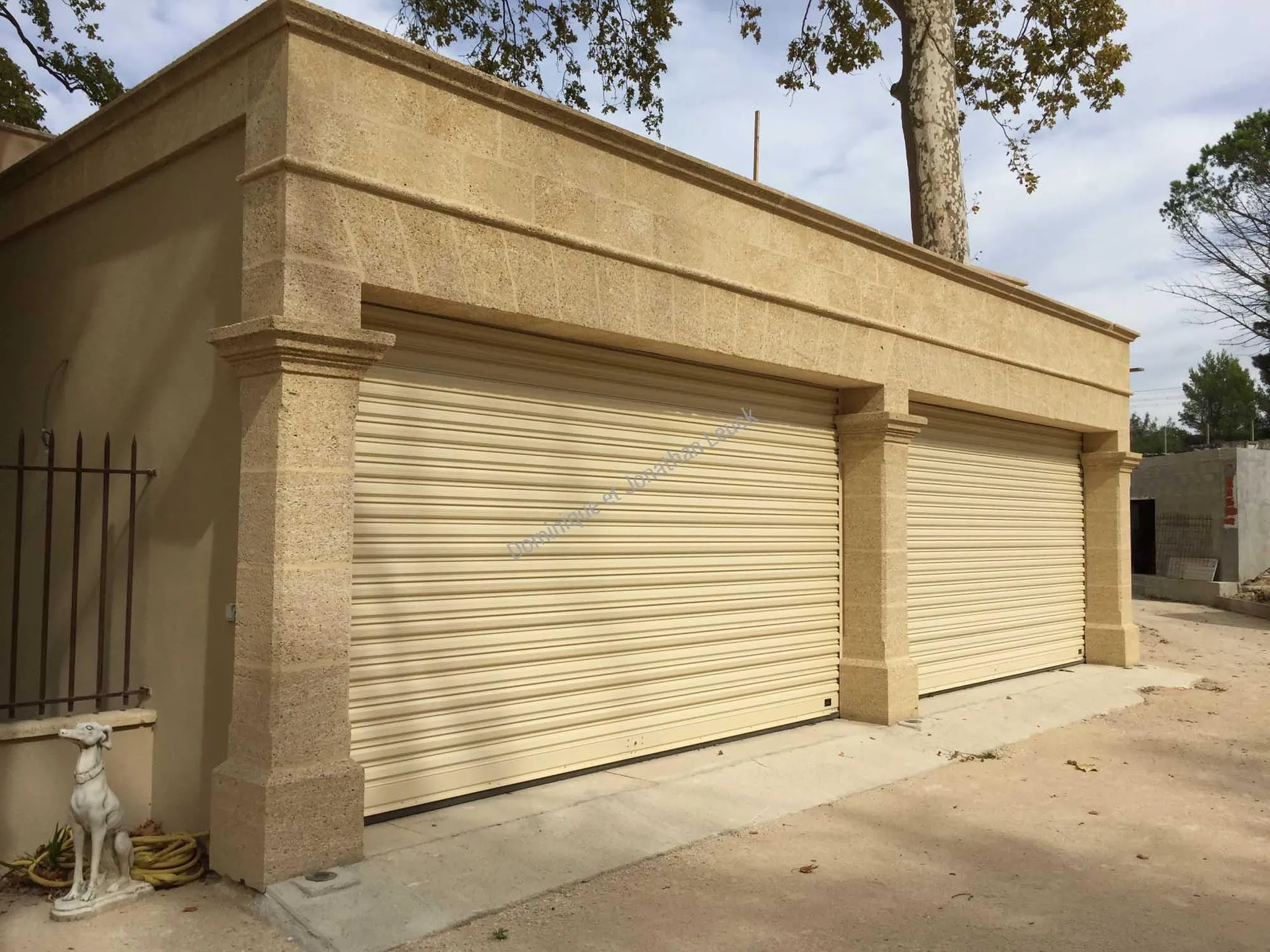 Réalisation d'encadrements en massifs pour une double ouverture de garage avec corniche et piliers en pierre du Gard.