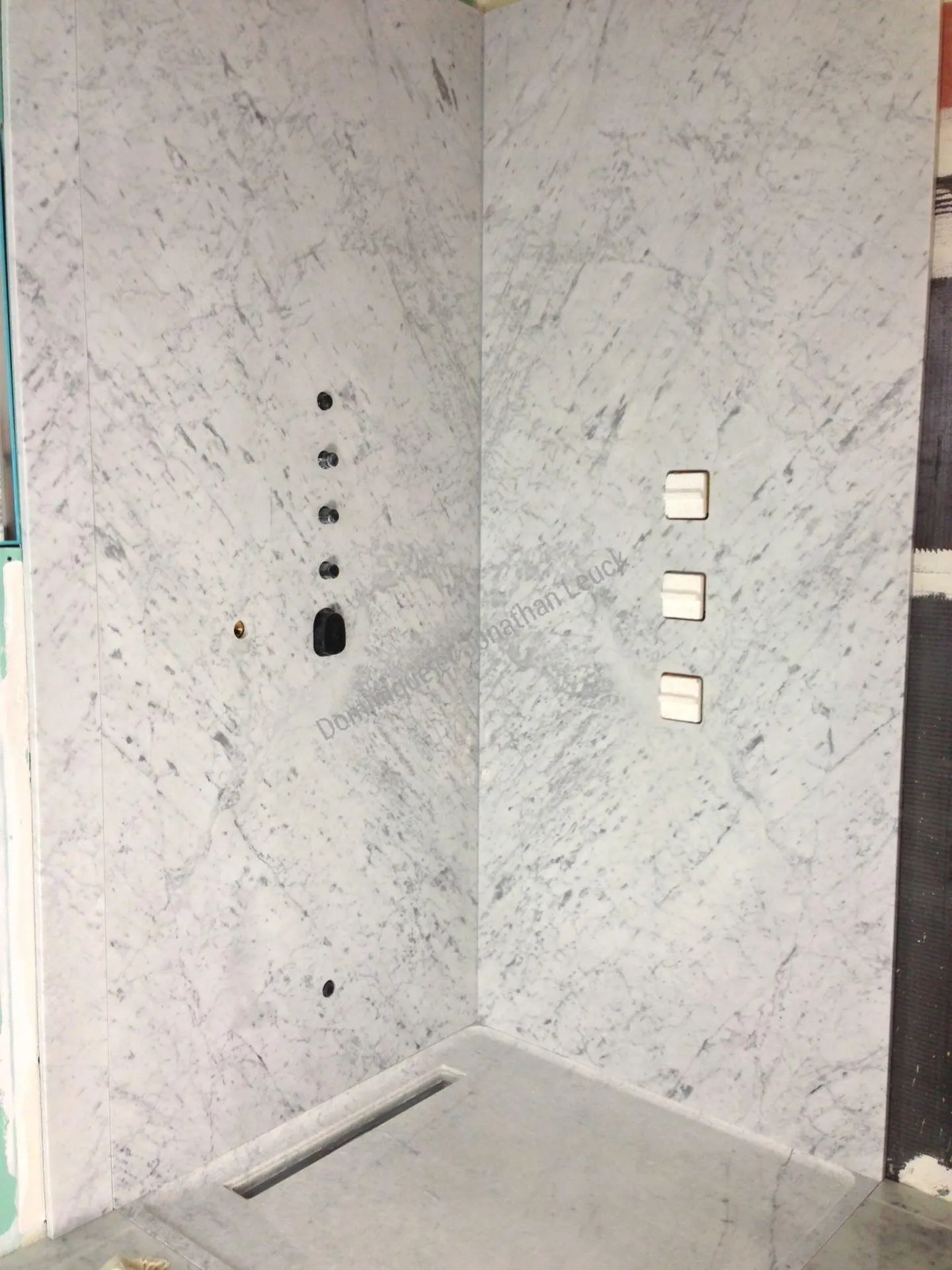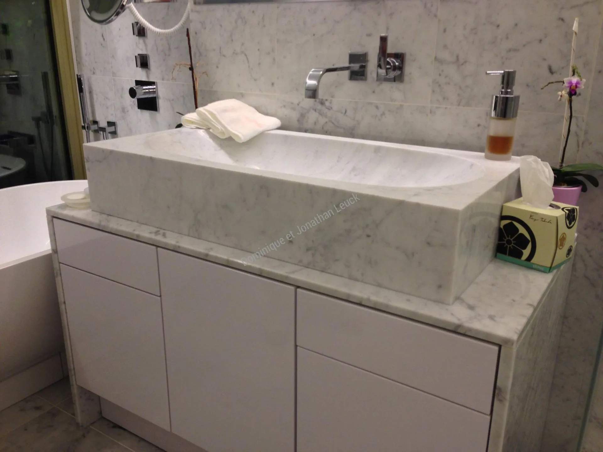 Salle de bains en marbre de Carrare, vasque, douche et sol.
