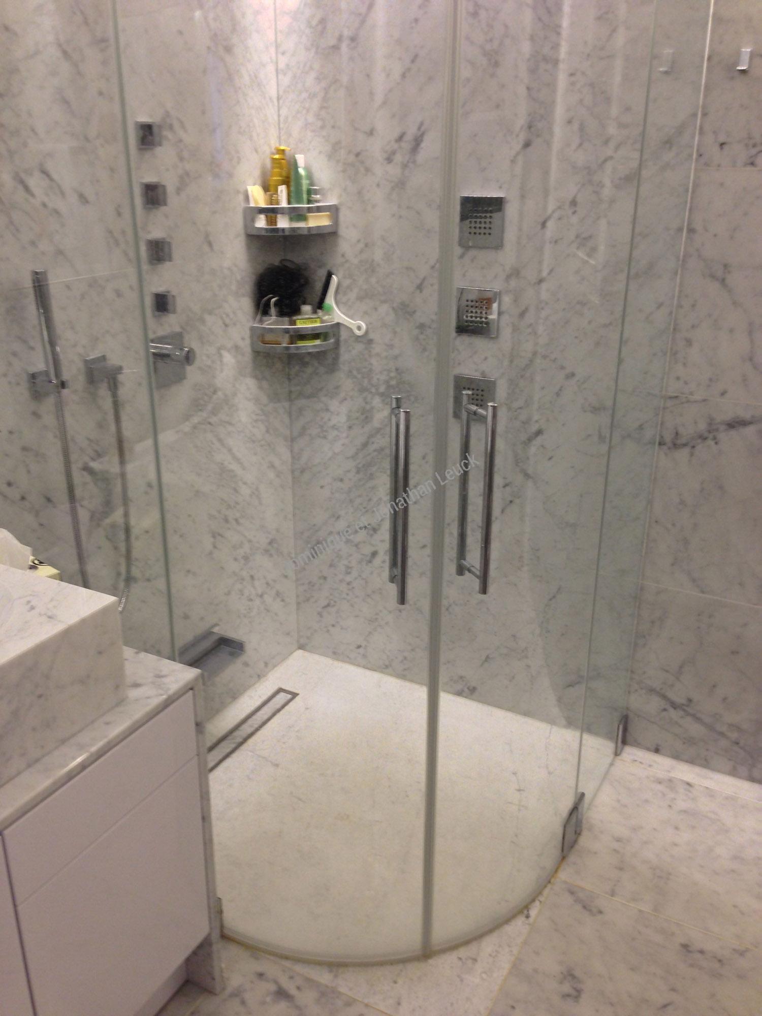 Salle de bains en marbre de Carrare, vasque, douche et sol.