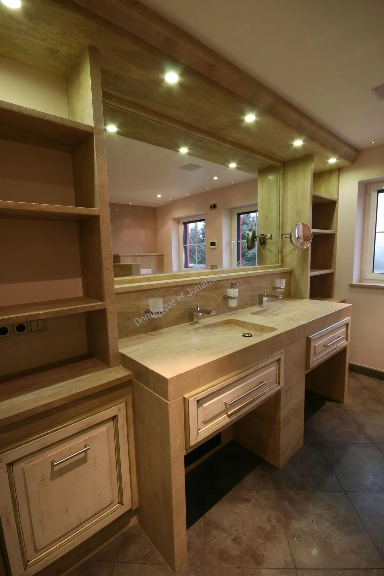 Aménagement d'une Salle de bain sur-mesure en pierre de Beauval finition adoucie ainsi que la création d'un plan vasque massif en pierre de Bourgogne, avec concept placards. Sur le Luxembourg.