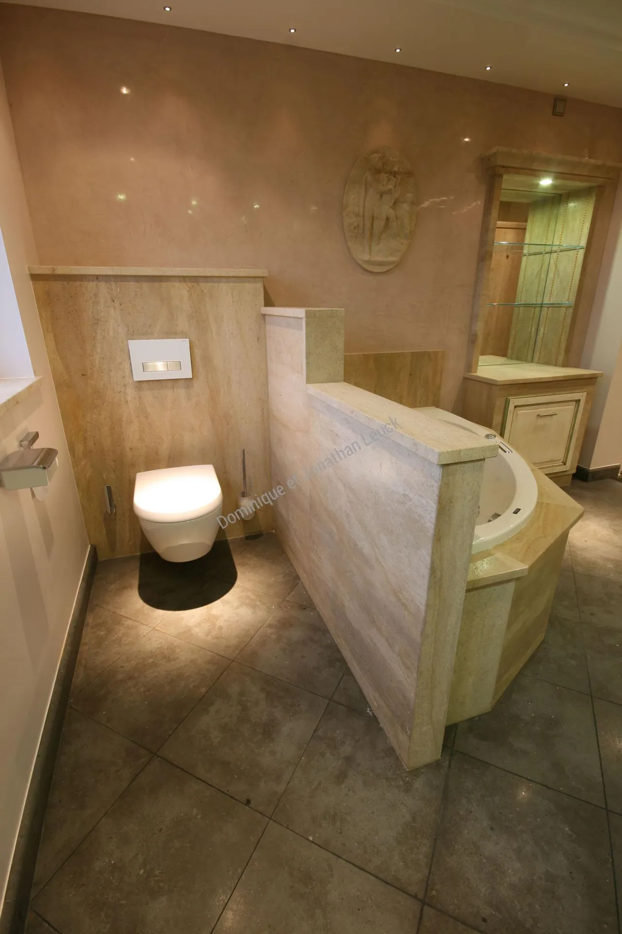 Agencement d'un habillage de baignoire et de wc ainsi que son mur de séparation en pierre de Beauval.