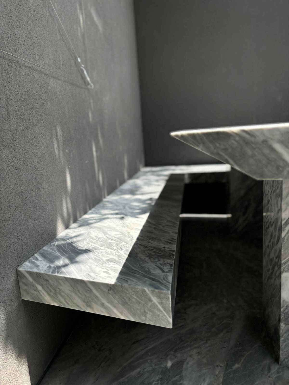 Marbre Bardiglio, nous avons réalisé la même finition sur l'ensemble du mobilier pour un visuel plus esthétique et harmonieux.